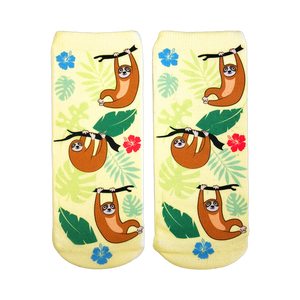 Who says sloths are slow? Tree Sloths Socks feature a menagerie of cartoon sloths hanging from branches with a big smile on their face. Crafted for women in mind, these ankle-high socks offer a cheerful splash of energy to your footwear collection. Wear them to bring a little fun and lightheartedness to your day. Be ready for questions like, "Hey, Where'd you get those sloth socks?"