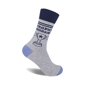 A trophy husband isn't easy to find, just like a sock that doesn't go missing in the laundry. These blue and gray socks are your perfect match. They're not afraid to show off their title, with "Trophy Husband" emblazoned on the side. You'll keep your feet feeling like royalty with these comfy crew socks.
