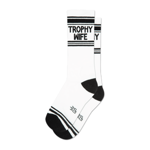 A bold statement in crisp white and classic black, these socks feature an upper cuff with several black stripes, setting the stage. Prominently displayed on the visible side, the words 'TROPHY WIFE' are knitted in sharp black lettering. Just below this sassy declaration, two more black stripes circle the ankle area. The heel and toe sections are solid black, adding a nice contrast to the clean white body. Near the arch, you'll spot some small, abstract black symbols, adding a subtle design touch. They're perfect for anyone who enjoys a bit of playful confidence and isn't afraid to show it off.