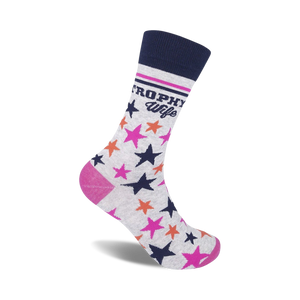 These Trophy Wife novelty socks are perfect for the woman in your life who loves a good laugh. She'll be the envy of all her friends when she rocks these crew socks with their dark blue cuff, white background with "Trophy Wife" written vertically in dark blue, framed by two vertical pink stripes, eight pink and orange five-pointed stars, and a pink toe and heel. Ideal for a bachelorette party, girls' night out, or just a fun day at the office!