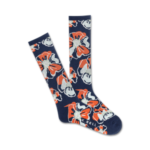 Tropical socks that pack a punch! Our Tropical Floral socks are decked in blue and bright orange hibiscus flowers, bringing you the feel of island vibes anyplace, anytime. These stylish crew-length tropical socks are the perfect fit for men looking for a fashionable, fun, and vibrant style. They're loud but not overwhelming; conversational if you want them to be. Perfect for a tropical-themed party or a gloomy Tuesday at work, these Tropical Floral socks will brighten your day and those around you.