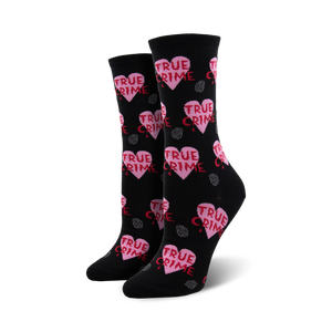 True Crime Crew Socks: Walk into a world where hearts and fingerprints collide! Black socks covered in pink hearts and red fingerprint outlines become a love-hate statement piece. Slip into these soft, eye-catching cotton-poly blend socks that pay homage to our favorite fictional detectives and the crimes they solve!