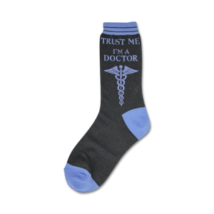 In a world plagued by skepticism, Trust Me I'm A Doctor socks serve as the antidote. The gray backdrop adorned with a caduceus in blue will have you channeling your inner doctor, while the words "Trust Me...I'm A Doctor" add a healthy dose of humor to your ensemble. Slip into these crew socks and watch as your patients - er, we mean friends - flock to you for medical advice. (No malpractice insurance included.)