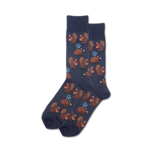 Gobble til you wobble in these Turkey Day crew socks! Featuring a flock of cartoon turkeys sporting Pilgrim hats and cornucopias, these socks are sure to get you in the Thanksgiving spirit. Don't be a turkey, strut your stuff in these festive socks and show everyone you've got the holiday spirit!
