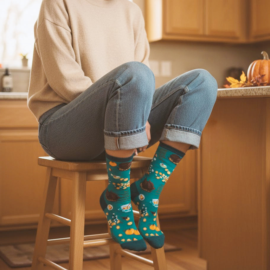 Turkey Dinner socks with mouthwatering designs of turkeys, pumpkins, pies, and flowers on a blue backdrop are here to spice up your fall fashion! Gobble, gobble your way into the festive season and pair it with your favorite outfit for a whimsical Thanksgiving ensemble. These crew-length socks are made just for women and will make you the belle of the ball at any holiday gathering. Strut your stuff like a turkey on Thanksgiving day with these fun and festive socks. Show your turkey love!