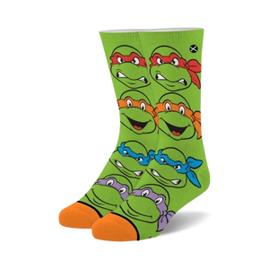 Sock it to your little one's feet with these gnarly Teenage Mutant Ninja Turtle socks. They're green and filled with the bodacious faces of Leonardo, Raphael, Donatello, and Michelangelo, arranged in two rows of three, just like they are in the sewer. These crew socks will make your kiddo feel like a totally tubular hero! Bring out their inner 'tude with these far-out socks.