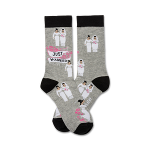Get ready to walk down the aisle in style with our "Two Brides" socks, featuring a playful pattern of brides holding hands and a "Just Married" speech bubble. These cotton crew socks are perfect for the modern, fun-loving bride who wants to add a touch of whimsy to her wedding day. Celebrate your commitment to love and equality in these comfy, stylish socks. And while you're at it, why not have your bridesmaids join in on the fun and get matching socks? Perfect for the pre-wedding festivities, on the big day itself, or even for the honeymoon. Let's put the 'fun' in dysfunctional family photos!