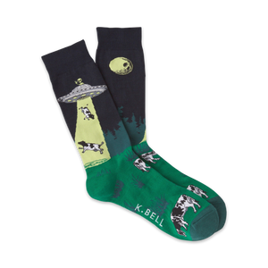 The price of milk may just skyrocket in the near future. I think a shortage of cows is upon us! These super cool black and green crew socks are out of this world. Each funny sock features a colorful display of a field with cows in it and a few being abducted by aliens. Take us to your liter… of milk.