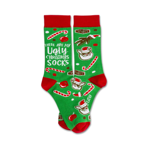 Prepare yourself for the utmost joyous Christmas celebration with these These Are My Ugly Christmas Socks ! Radiate holiday vibes with these green and red beauties featuring candy canes, presents, Santa hats, and snowflakes. Keep your toes feeling merry while spreading yuletide cheer wherever you go. Deck your feet in hilarious fashion with these socks that proudly proclaim, These Are My Ugly Christmas Socks.