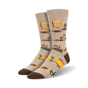 Calling all bulldozer drivers, dump truck enthusiasts, and steamroller superfans! Get ready to embark on a construction adventure with our Under Construction socks. Featuring a vibrant pattern of yellow bulldozers, dump trucks, and steamrollers, these beige crew socks for men are like wearable construction zones. Whether you're a hard-working man on the job site or just someone who loves big machines, these socks will put a smile on your face and make you feel like you're part of the crew. Fun fact: Steamrollers were invented in the 1870s and initially used steam engines for power. So, put on a pair of Under Construction socks and let your feet do the talking!