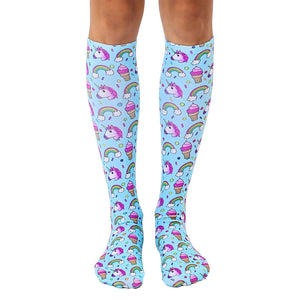Unicorn Party Knee-High Socks: Blast off into a fantastical realm with these dreamy knee-high unicorn crew socks! A whimsical parade of unicorns, rainbows, ice cream cones, and fluffy clouds dance across a soft blue backdrop, making every step magical. Slip into these socks for a touch of whimsy and adventure around every corner - you might just find that magic is real after all!