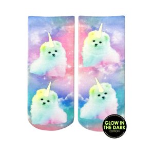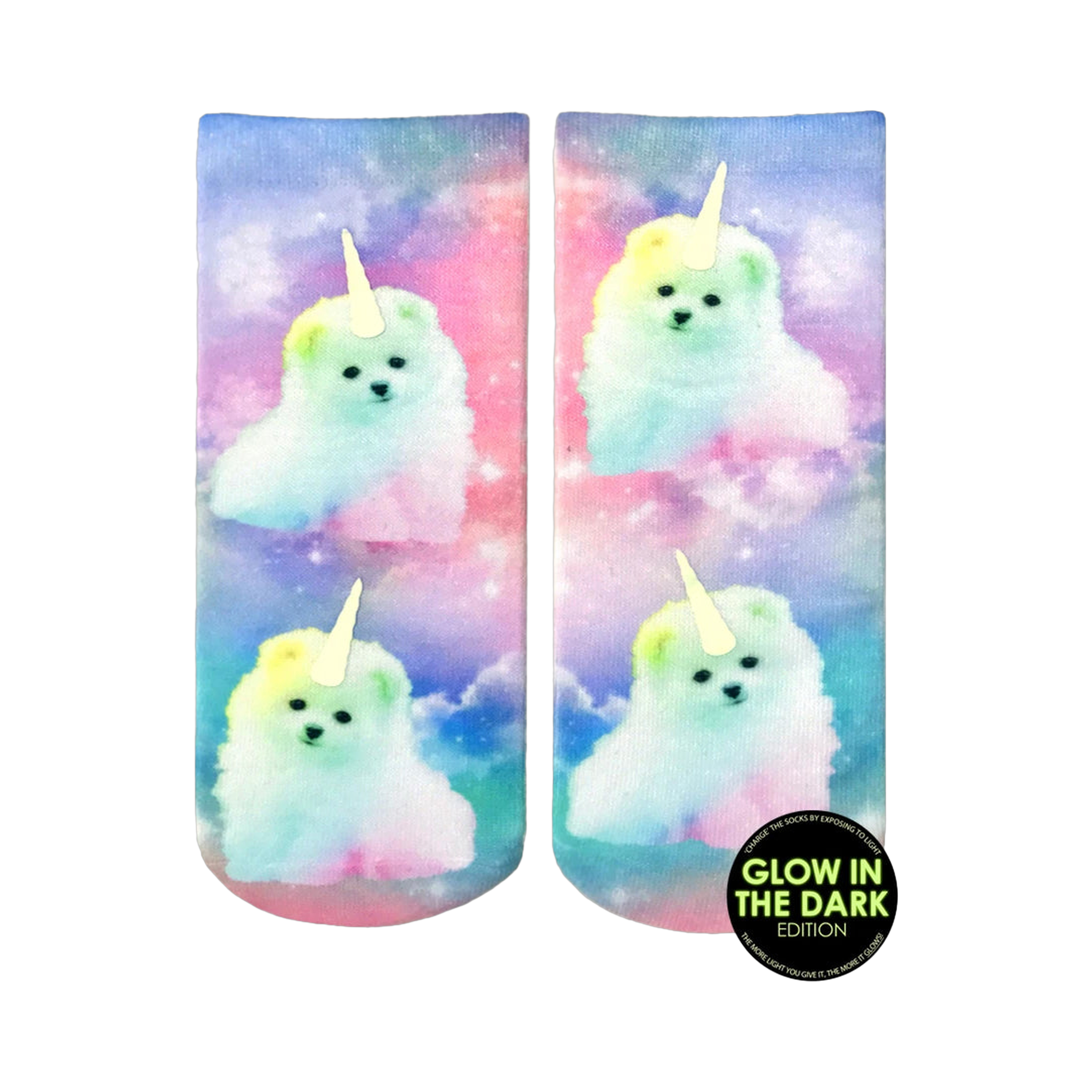 Unleash the magic of mythical canine companions with these Unicorn Puppy Glow in the Dark Novelty Socks. Step into a world of enchanting enchantment as these socks bring your favorite dreamy creature to life, their glowing rainbow horn and tail illuminating your path. Perfect for adding a dash of whimsy to your daily style or enchanting your nighttime adventures with a glowing spectacle, these socks are a must-have for unicorn enthusiasts and those who embrace their inner puppy.