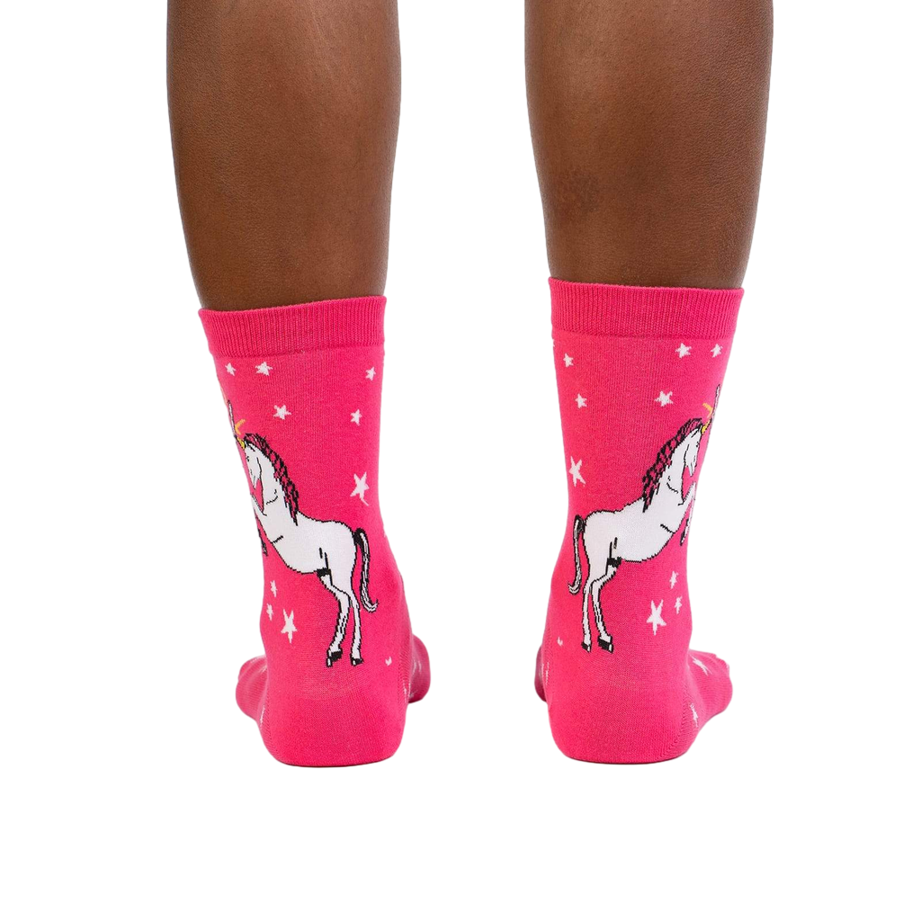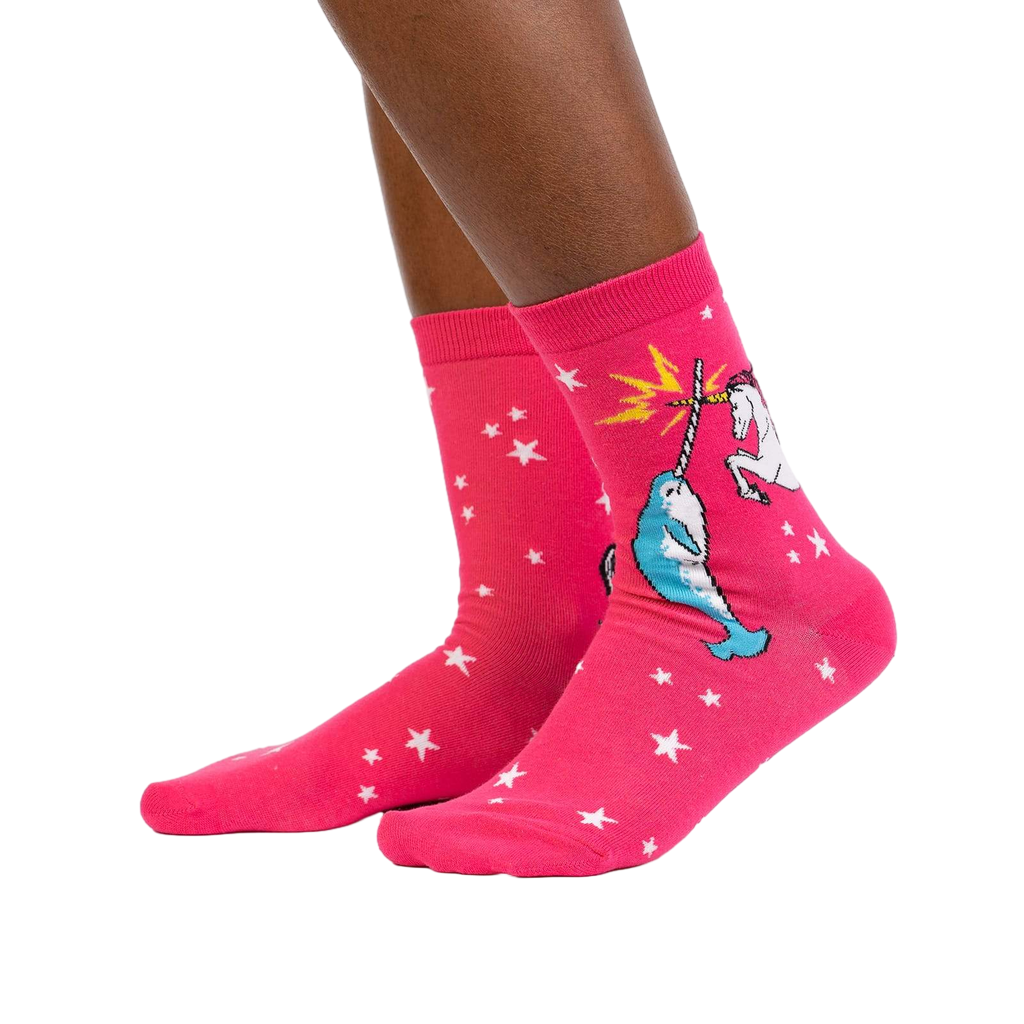 These crew socks are hot pink with white stars and feature a whimsical scene: a unicorn and narwhal battling it out with a sparkly horn-to-horn clash! The visible portions show a bright, colorful design. They're comfy, fun, and perfect for adding a touch of mythical mischief to your everyday outfit. The pink is vibrant, and the unicorn and narwhal are clearly the stars of the show, along with the little white stars sprinkled on the sock itself.
