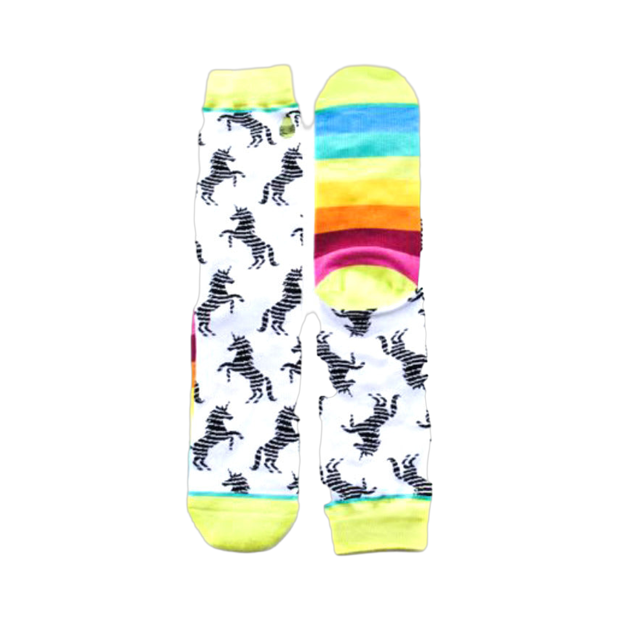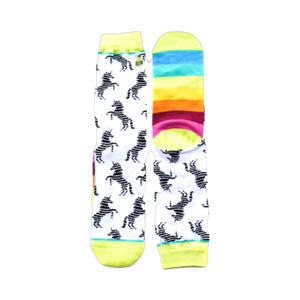 Sprinkle whimsy into your ensemble with our Unicorns & Rainbows white crew socks, an enchanting piece for fabulous ladies! The black unicorns prance playfully, their rainbow manes and tails trailing behind like a colorful breeze. A vibrant rainbow stripe crowns the sock, while a splash of neon yellow at the heel and toe adds a playful pop. Let these socks be your reminder that magic awaits even in the most ordinary places!