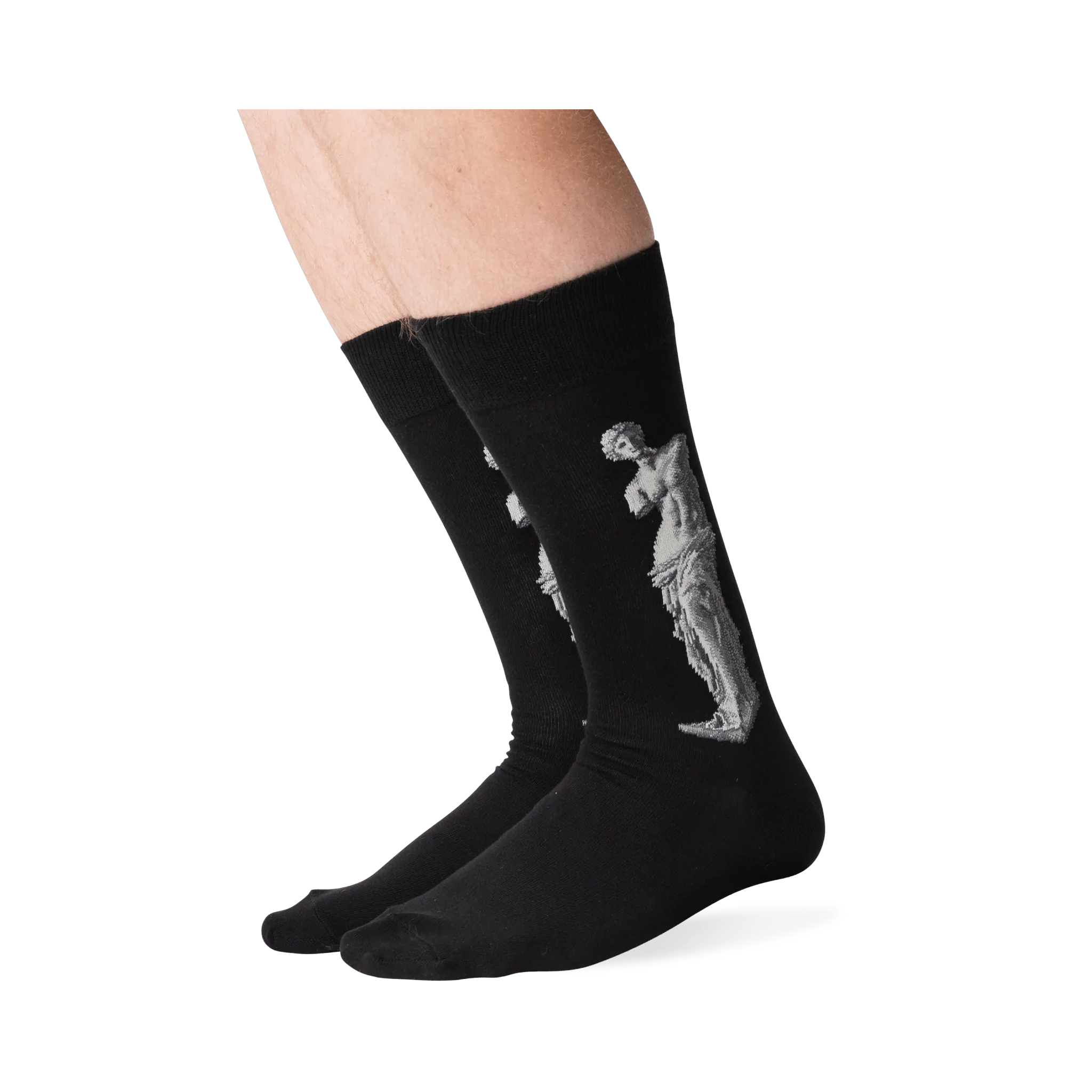 Let this armless beauty showoff your love for timeless Greek art and ancient sculptures! These cool purple crew socks feature a classic black and white print of Alexandros of Antioch's famous statue, the Venus de Milo. Wear these beautiful, artistic socks on your next trip to the art museum or to your art class.