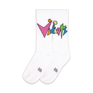 Bid your boring socks adieu and step into the realm of absurdity with Vidiots! Our white crew socks are adorned with a vibrant kaleidoscope of geometric shapes and the word "Vidiots" splashed across them in bold, playful letters. Like a movie buff's secret handshake, these socks will have fellow cineastes nodding in knowing appreciation. Remember, life's too short for dull socks; embrace the quirks and let your feet do the talking.