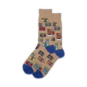 Not your grandpa's cameras! These hip socks feature a colorful pattern of vintage cameras. With blue toes and heels, they're the perfect conversation starter. Slip into a pair and show off your quirky style. Fun fact: the first digital camera was invented in 1975, but it wasn't until the 1990s that digital cameras became widely available. Snap up a pair of these socks today!