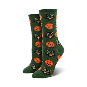 Spooktacular Vintage Halloween Women's Crew Socks: Get ready for frightful fun with these wickedly cute socks featuring a cheerful pattern of black cats and grinning pumpkins on a vivid green backdrop. Perfect for trick-or-treaters and Halloween lovers alike, these socks bring a bit of vintage charm to your spooky season style.
