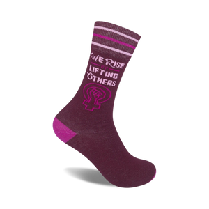 We Rise socks embody strength & resilience! Walk tall in these purple socks featuring the text 'We Rise By Lifting Others' in pink & a symbol of a woman fist raised high, reminding you to lift others as you rise. With a comfy pink & white striped band & pink heel/toe. It's a subtle reminder that together, we can achieve greatness.