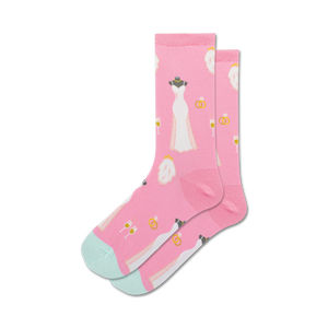 Get ready for a wild wedding day with our Wedding Dress socks! These pink crew socks feature a fun pattern of white wedding dresses, gold wedding rings, champagne glasses, and black top hats that will make you the hit of the party. Whether you're the bride, the groom, a bridesmaid, a groomsman, or a guest, these socks are sure to get you in the celebratory spirit! Like the institution of marriage, these socks are made to last. They're made from high-quality materials that feel soft and comfortable all day long. Plus, they're machine-washable and dryer-safe for easy care.