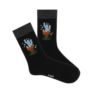 Picture the endless expanse of a desert night, where the sky dazzles with stars and the cacti stand tall in silhouette. These Western Night socks capture that serene beauty with a playful twist, adorning your feet in a design that brings the twinkling night sky right to your toes. The metallic yarn cuffs shimmer like stars, adding a touch of magic to your every step, as if you're walking through a midnight desert under a celestial canopy.