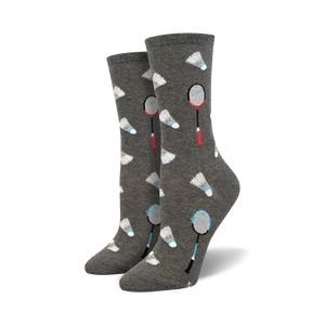 Here's a fun and light-hearted description of the socks: Serve up a stylish ace with these badminton crew socks boasting a pattern of red, blue, yellow, and white shuttlecocks and rackets. With a snappy title like "What A Racket," these socks are sure to score high on the fashion court. Not only will you look like a pro, but you'll be one too, because these socks double as a good luck charm for your next match. And guess what? They come with a free copy of "The Badminton Bible" to help you brush up on your skills.