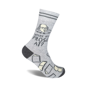 Novelty Crew Socks: Style and Wit for Your Feet! Don't just wear regular socks ”express your literary wit with these "Where My Prose At?" socks! Featuring a black Elizabethan man and "Where My Prose At?" script, these gray socks with black toe, heel, and top stripes are perfect for Shakespeare and literature fans. Represent your love for the Bard with a touch of humor and show off your passion for the written word in a fun, eye-catching way! They're comfy, stylish, and ready to take you on any adventure!