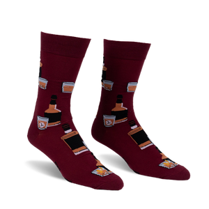 Bring a little happy hour to your feet with these rich burgundy socks. They're covered in a repeated pattern of classic whiskey bottles, each shown with a light brown label and amber liquid inside. Right next to them, you'll see short, clear glasses, also filled with that warm amber hue and visible ice cubes. It's a smooth design for anyone who appreciates the finer things, or just a good, chill vibe. Perfect for adding a bit of sophisticated fun to your day, without all the actual business.