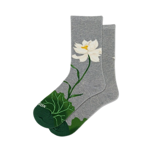 It's not every day you find socks that celebrate a flower as stunning as the lotus. These gray socks with a white lotus flower pattern let you carry a symbol of strength and enlightenment with you everywhere you go. Each pair features green leaves and a yellow center for a bold look that's as vibrant as the flower itself. Take a walk on the bright side with these socks and show off your unique style!