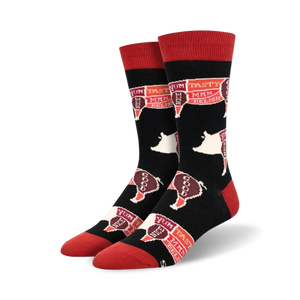 There's more to these socks than meets the eye just like a whole hog! Made for men, these crew-length socks have a black backdrop with a red toe, heel, and top. An outline of a pig takes the stage on each sock, but only true hog fans will catch the hidden 'Whole Hog' inscription. Show your appreciation for swine with these trot-tastic socks.