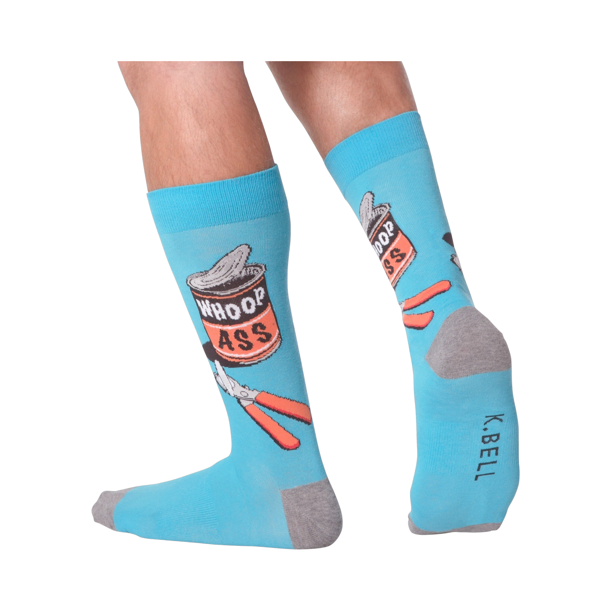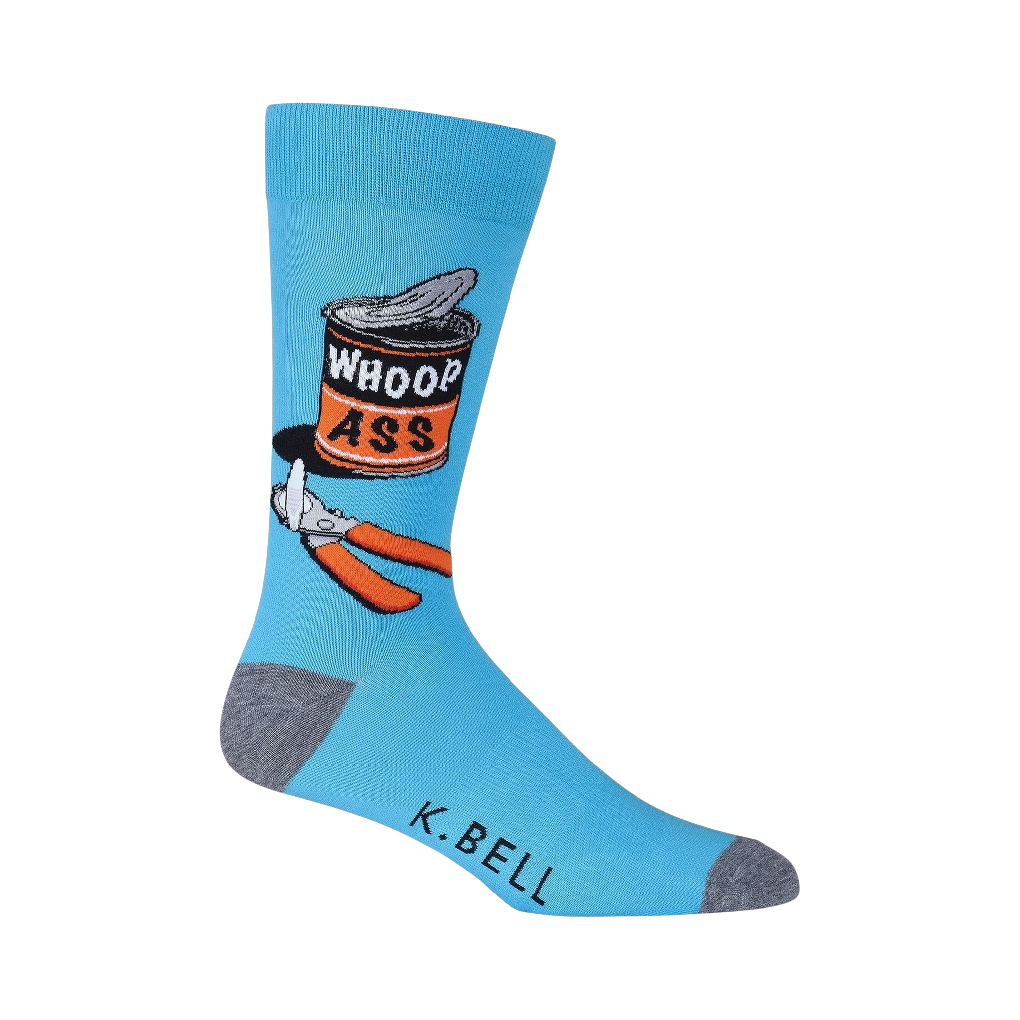 No matter what has you down, sometimes you need to reach for a big can of Whoop Ass, crack it open, and press on! This funny pair of blue and gray crew socks features an open can of "whoop ass" with a can opener in front of it. Let everyone be warned with this cool yet silly pair of socks.