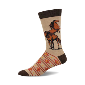 Wild horses gallop through the pages of history with a spirit so free, its captured in the playful design of these socks. Unleash your inner mustang every time you slip these on and feel the energy and wild beauty of the open plains. With a delightful display of two spirited horses and a lively geometric pattern, these socks are a nod to the untamed majesty of nature's true horsepower.