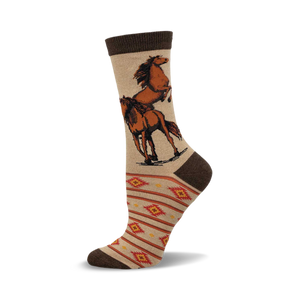You know that feeling when the wind whips through your hair and you feel untamed and free? That's the spirit embodied by these tan socks, adorned with a majestic brown horse design. With every stride, you channel the raw power and grace of wild horses, complemented by a vibrant red and yellow geometric pattern at the bottom. These socks are more than just a fashion statement; theyre an ode to the unbridled beauty of natures most poetic creatures.