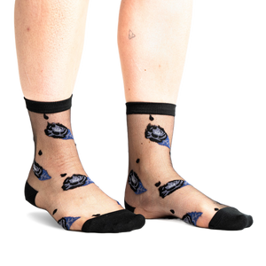 Okay, so these aren't your typical garden variety roses. They're giving off a whole different vibe, a bit moody and mysterious, just like the title hints at. You've got these cool sheer black socks, totally see-through, with chunky solid black cuffs, heels, and toes. All over the sheer part, there are these stylized roses in dark shades of purple-blue and black, with some lighter blue accents. They look a bit like they're sketched or painted on, giving them a really unique, slightly edgy feel. Scattered around the roses are little black dots, adding to that cool, subtle pattern. These are perfect for when you want a delicate touch with an unexpected twist. They'll peek out perfectly with any shoes that show a little ankle.
