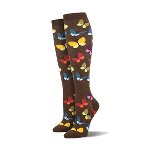 Flutter into any event with our vibrant "Wind Beneath Our Wings" socks! These brown crew-length charmers boast a kaleidoscope of colorful butterflies guaranteed to add a splash of fun to your feet. Perfect for garden parties or just lounging around, they add a touch of whimsy to whatever you wear. Ready to let your style soar with a pair that captures your spirited vibe? Snatch up these butterfly beauties and let your true colors shine at your next casual hangout or cozy retreat!