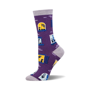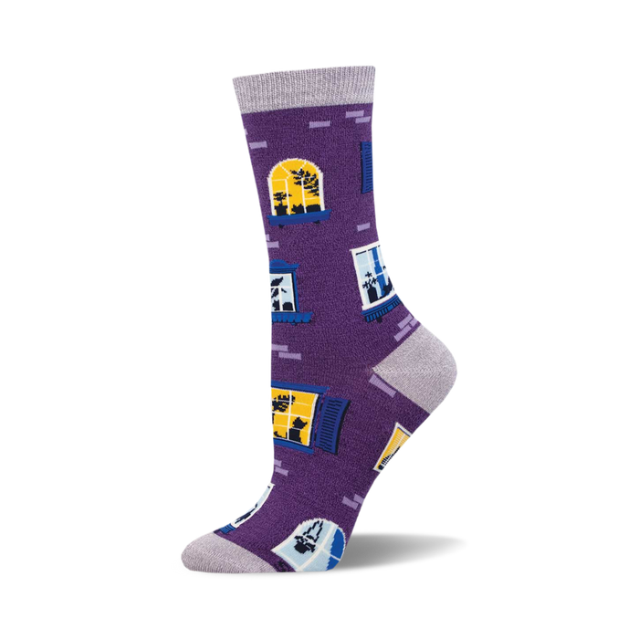 Brighten up your day and flaunt your feline flair with our Window Cats Bamboo socks! These crew-length charms feature playful cats peeking from vibrant blue and yellow windows, all set against a sleek purple background. Whether you're lounging at home, tackling the office, or jazzing up your casual brunch outfit, these socks are purr-fect. Hosting a cat-themed party? Don't forget your socks! Why not make every step a statement with a splash of color and a dash of whimsy? Go on, let your paws do the talking and grab a pair today!