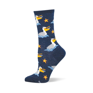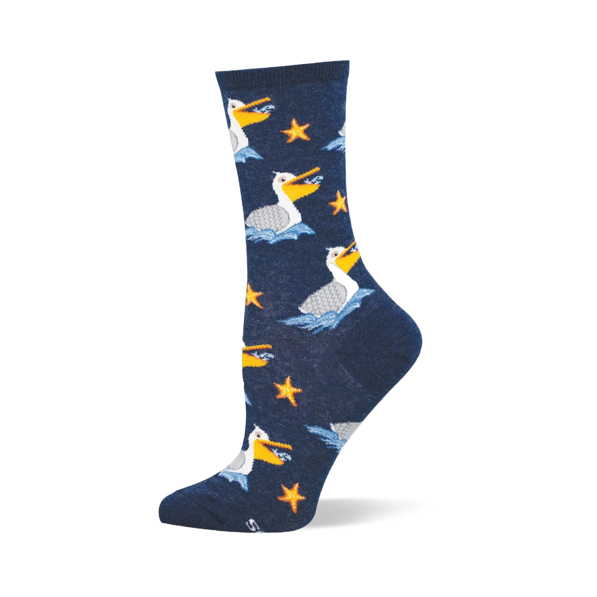 Pelicans, stars, and rolling water give these women’s crew socks a playful coastal look that feels breezy without trying too hard. The birds are drawn with a comic, wide-beaked charm, like they know exactly where the fish are and are not above making a scene about it. It’s the kind of pattern that keeps finding new details the longer you look at it.