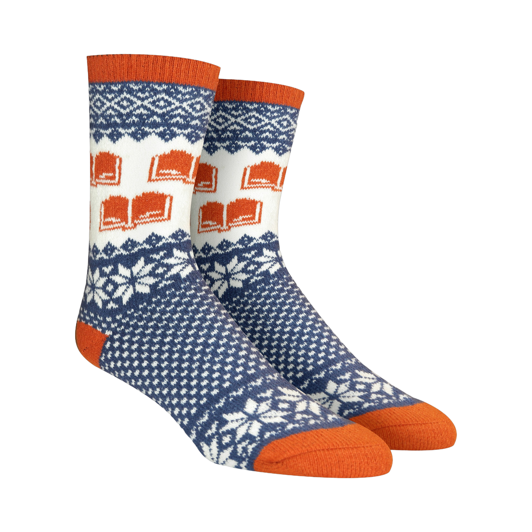 Wish your feet could read a good book? Well now they can! These Winter Reading socks are the perfect blend of literature and lounging. The playful pattern of orange books against a navy blue backdrop will have you feeling cozy and cultured no matter where you go, while the snowflakes add a touch of winter whimsy. It's like having your own personal library right on your feet. Put on a pair and let your toes curl up with a good book.