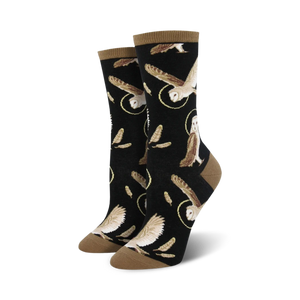 Wise and Shine with these black crew socks featuring an eye-catching pattern of white and brown owls and feathers. Perfect for those who love animals and a touch of whimsy, these socks will add a fun pop to any outfit. Plus, they'll remind you to stay wise and keep shining, no matter what.