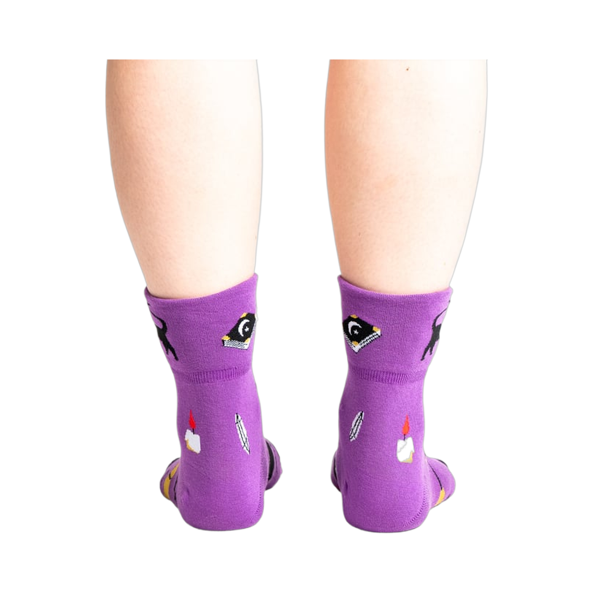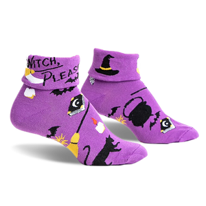 Ever wonder what a dash of whimsy and a sprinkle of sorcery could do for your wardrobe? Enter our witch turn cuff socks, where style meets spellbinding charm. These purple wonders are adorned with a cheeky black cat, a mystical witch's hat, a bubbling cauldron, and a trusty broom. And let's not forget the sassy "witch please" emblazoned across the front, making these socks the perfect accessory for conjuring up some fashion magic.