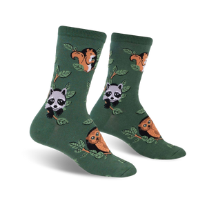 Woodland Watchers Crew Socks: Your feet will be the envy of the forest with our Woodland Watchers socks! These green and lively socks feature a pattern of furry raccoons, wide-eyed owls, and bushy-tailed squirrels climbing on branches filled with vibrant green leaves. They'll make you feel like you're on a nature hike every time you put them on. Plus, these socks are made with durable, stretchy fibers that will keep you comfy all day long. Don't let your feet get bored, let them explore the wild side with Woodland Watchers socks!