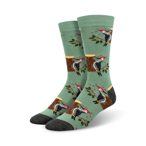 Take a walk on the wild side with these eye-catching woodpecker bamboo socks! The black, white, and red woodpeckers pop against the green backdrop of trees, stumps, and leaves. The ribbed top and gray toe and heel add comfort and style to these fun socks. Whether you're hiking in the woods, pecking away at your latest project, or just relaxing at home, these socks are sure to bring a smile to your face. Hey, don't be surprised if you find yourself pecking at your sock while wearing these woodpeckers!