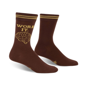 Raise the roof with our 'Work It' socks! These brown socks, with their bold gold letters and gold toe and heel, are guaranteed to grab attention. Put a pair of these crew-length socks on and get ready to strut your stuff. Ideal for men who appreciate a touch of geeky style. Who knows, you might even find yourself chanting "work, work, work it" as you walk down the street!