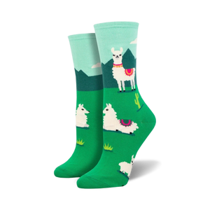 Yo, llama lovers! Get ready to hoof it in these super cute and comfy llama socks! With their white coats, pink and black details, and adorable faces, these llamas are sure to make you smile. They're standing tall in a green field with cactii and mountains in the background, reminding you that even the smallest creatures can be incredibly resilient. Show off your llama love and spread happiness wherever you go!