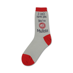 Think you've heard all the sock jokes? Think again! These "You're Muted" novelty socks will get a laugh from anyone who can hear you coming from a mile away. We're talking sassy socks for women. They're grey with red toes and heels, and have red text that says "I Can't Hear You. You're muted!" with a red circle and a line through it. In this age of video conferencing and virtual meetings, these socks are the perfect way to make a statement digitally.