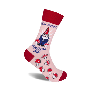 You Don't Gnome Me socks add a magical touch to your feet. With a cartoon gnome in a red shirt, blue hat, white beard, and a determined look, these red and pink socks say it all. The sock's subtle pattern of red mushrooms adds a whimsical touch. Who knew gnomes could be so sassy? Show off your fun side in these novelty socks, and let the world know You Don't Gnome Them.