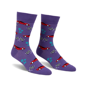 Got a need for speed or just appreciate a smooth ride? These purple socks are packed with a fun, classic car vibe. You'll see rows of bright red convertible cars, complete with their little white tops, cruising alongside crossed black and white checkered flags. Dotting the background are cool teal palm trees, giving the whole design a sunny, open-road feel. It's a playful pattern that perfectly captures a bit of that crazy, exhilarating freedom you get from hitting the highway. Put them on and feel ready for whatever the day brings, whether it's a long drive or just a chill afternoon.