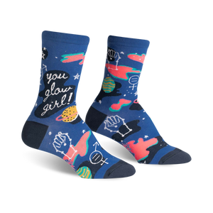 Ready to let your soles shine like the night sky? Say hello to You Glow Girl socks! These rad kicks are decked out in bright blue with celestial bodies and the inspo-boosting message "You Glow Girl" shining on the left sock. Embrace the cosmic vibes and radiate confidence with every step!