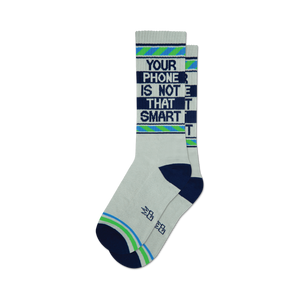 Brighten up your day and outfit with our "Your Phone Is Not That Smart" socks! Sporting playful green and blue stripes framing a cheeky message, these socks are perfect for sparking conversations and laughs at tech meetups or casual hangouts. Whether you're making a style statement or just want to keep your feet cozy while reminding everyone to look up from their screens, these socks are just the right mix of fun and function. Who needs a smart phone when you have even smarter socks? Treat your feet or give the gift of humor and comfort!