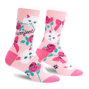 These 'You're Purrfect' socks are adorable! They're a light pink with a fun pattern featuring white kitties, pink roses, and pink bows. The visible text says 'Purrfect!' in a cute, slightly quirky font. The socks have a pink toe and heel. They're comfy and cheerful – perfect for adding a little feline flair to your day.